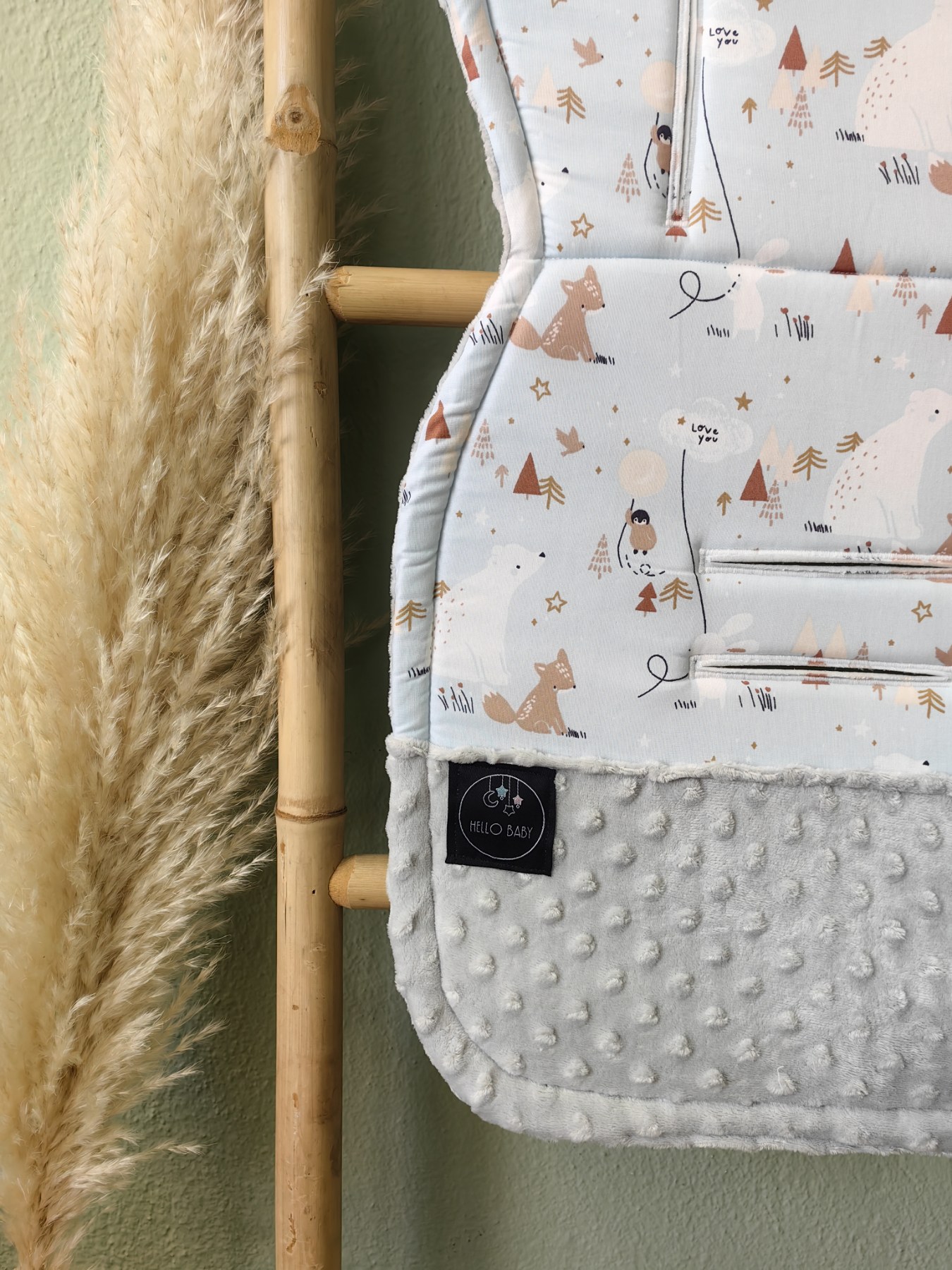 Μπορεί να χρησιμοποιηθεί χειμώνα καλοκαίρι καθώς είναι διπλής όψης. Κατασκευασμένο με βαμβακερό ύφασμα από την μια πλευρά και βελούδινο minky από την άλλη, ενώ στο πίσω μέρος διαθέτει λάστιχο για να εφαρμόζει απόλυτα σε κάθε καρότσι .