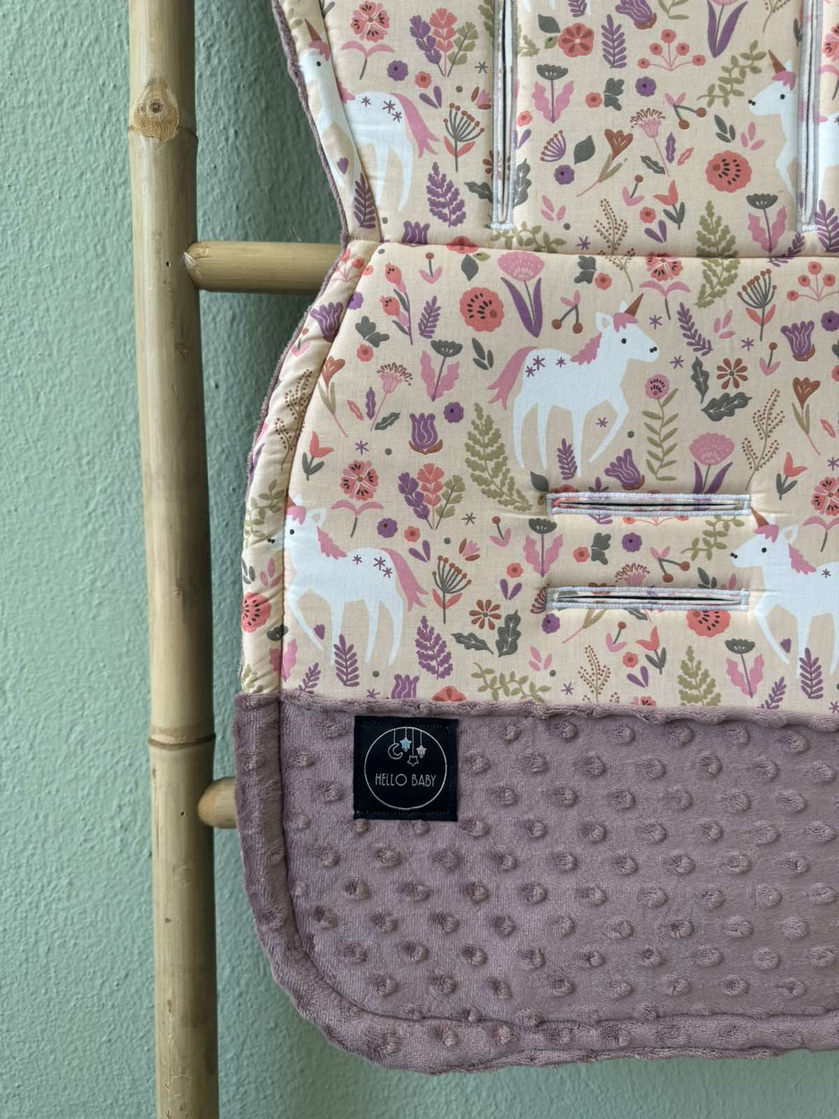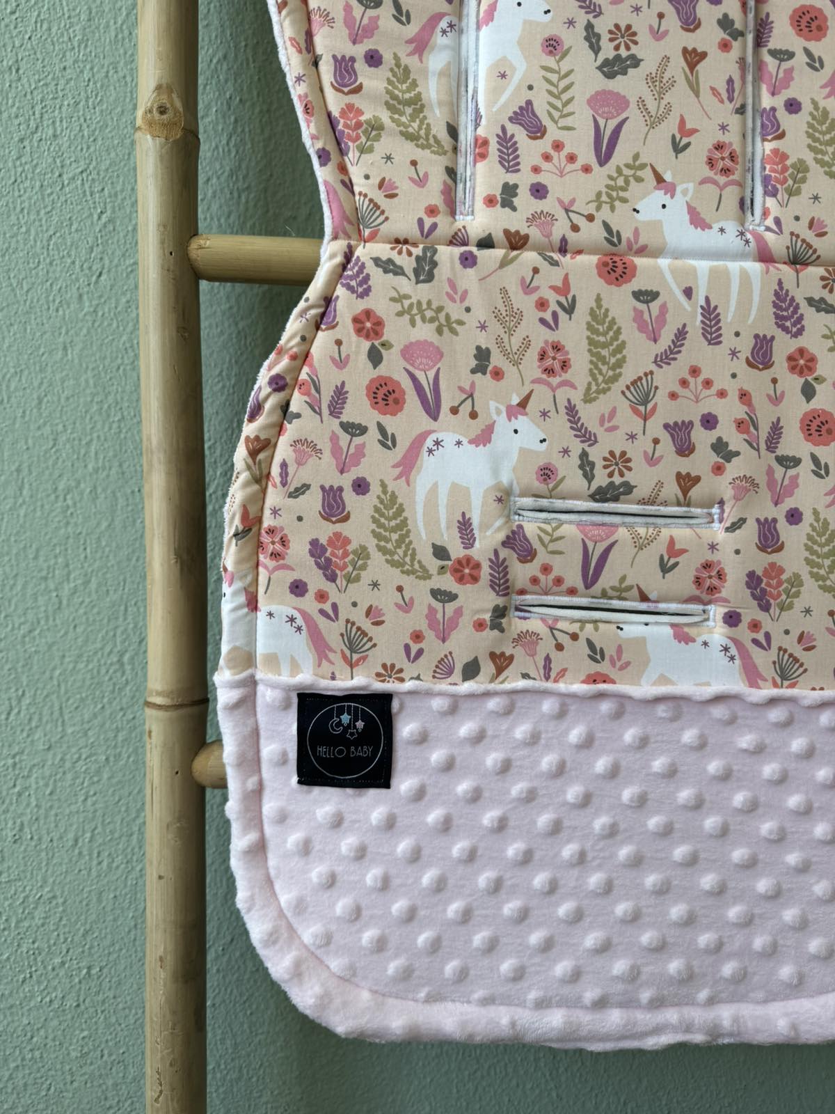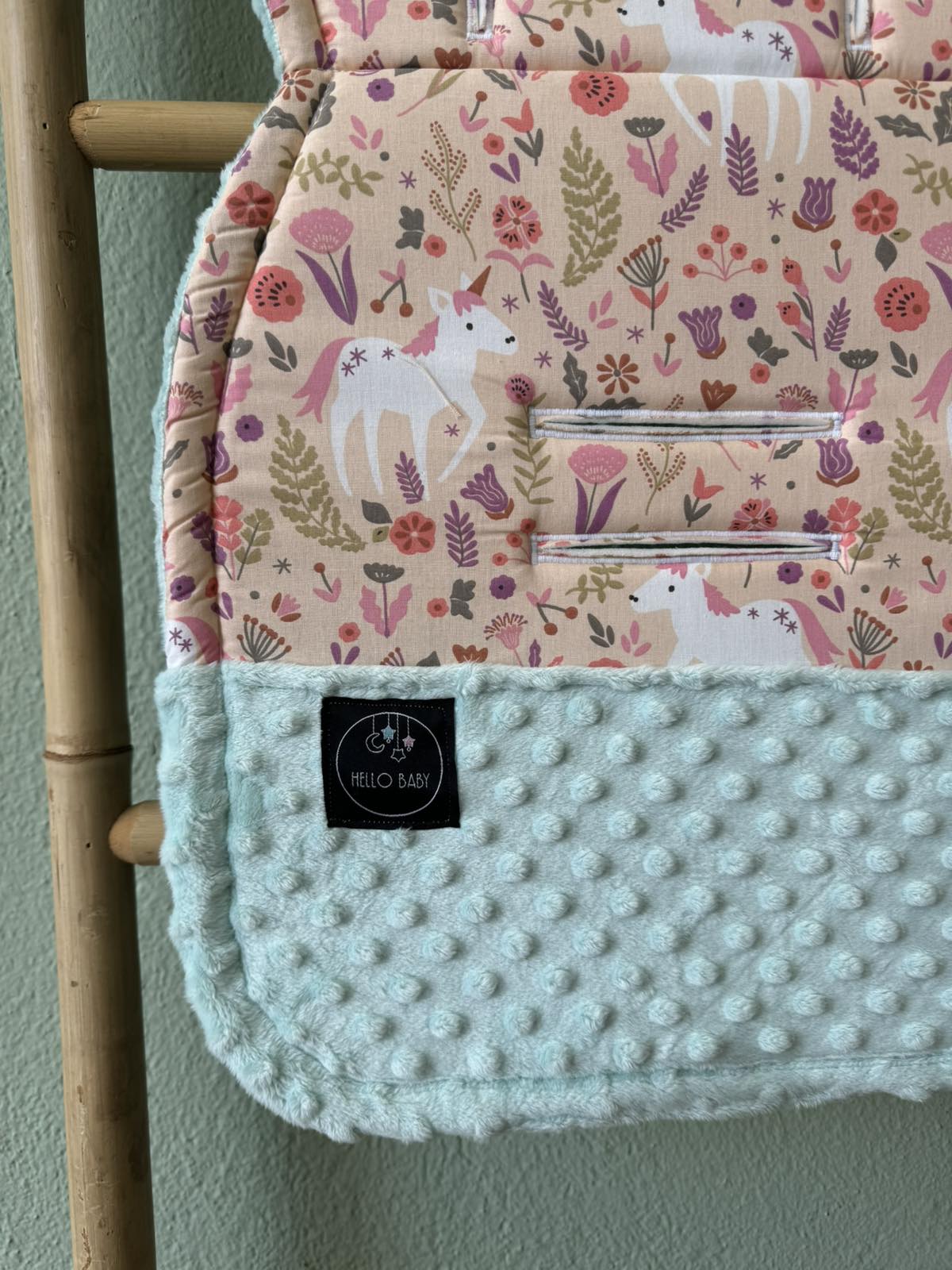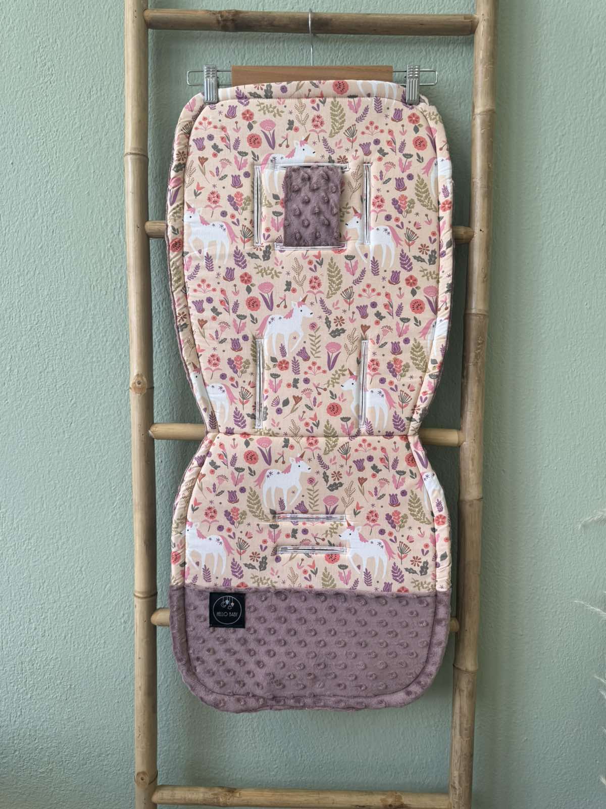 Μπορεί να χρησιμοποιηθεί χειμώνα καλοκαίρι καθώς είναι διπλής όψης. Κατασκευασμένο με βαμβακερό ύφασμα από την μια πλευρά και βελούδινο minky από την άλλη, ενώ στο πίσω μέρος διαθέτει λάστιχο για να εφαρμόζει απόλυτα σε κάθε καρότσι .