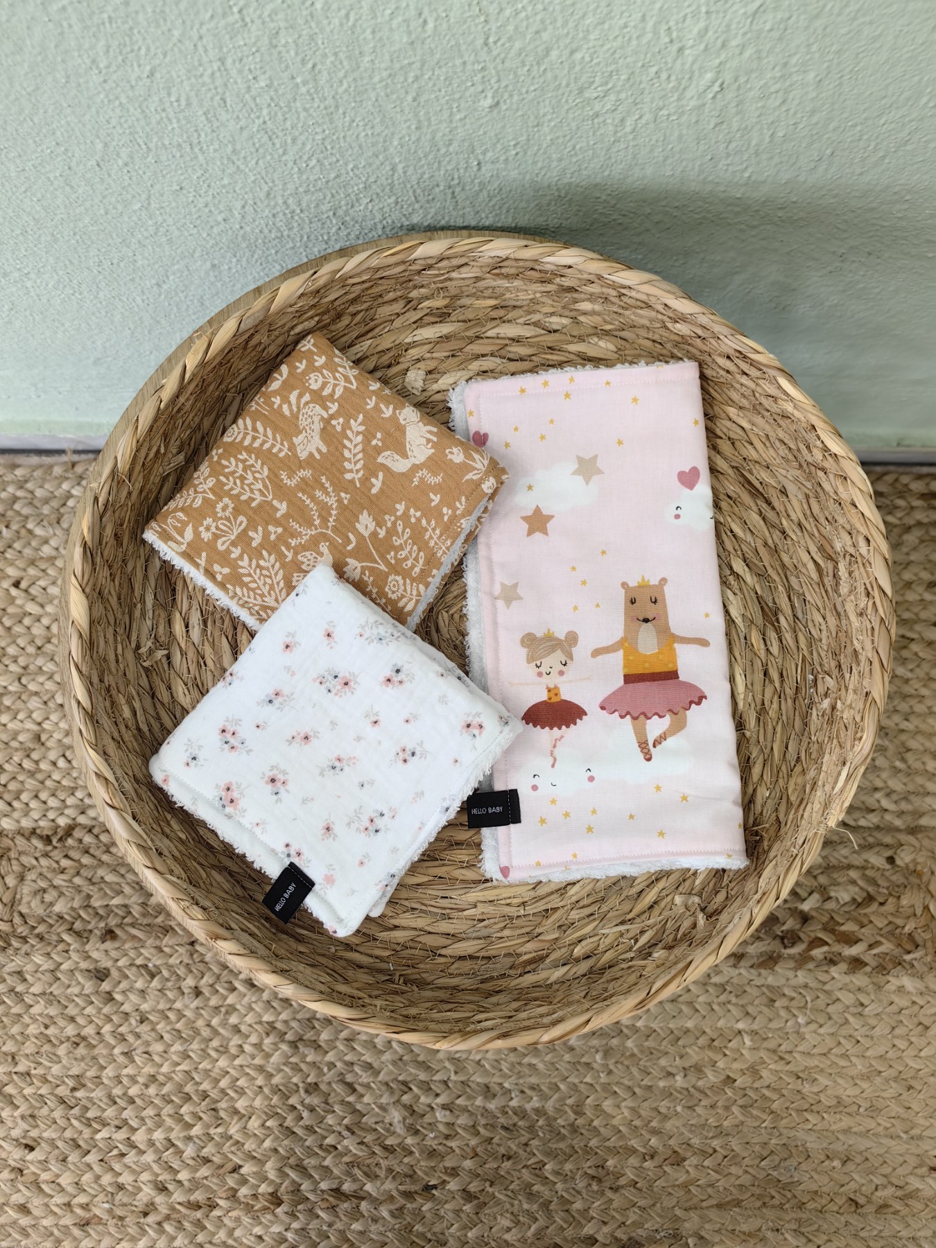 Είναι διπλής όψης, με 100% βαμβακερό ύφασμα ή μαλακή μουσελίνα από τη μία και απορροφητική πετσέτα από την άλλη.