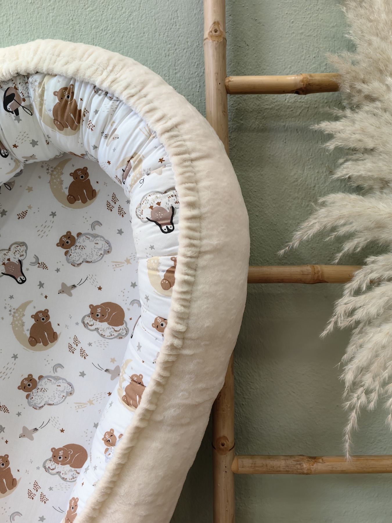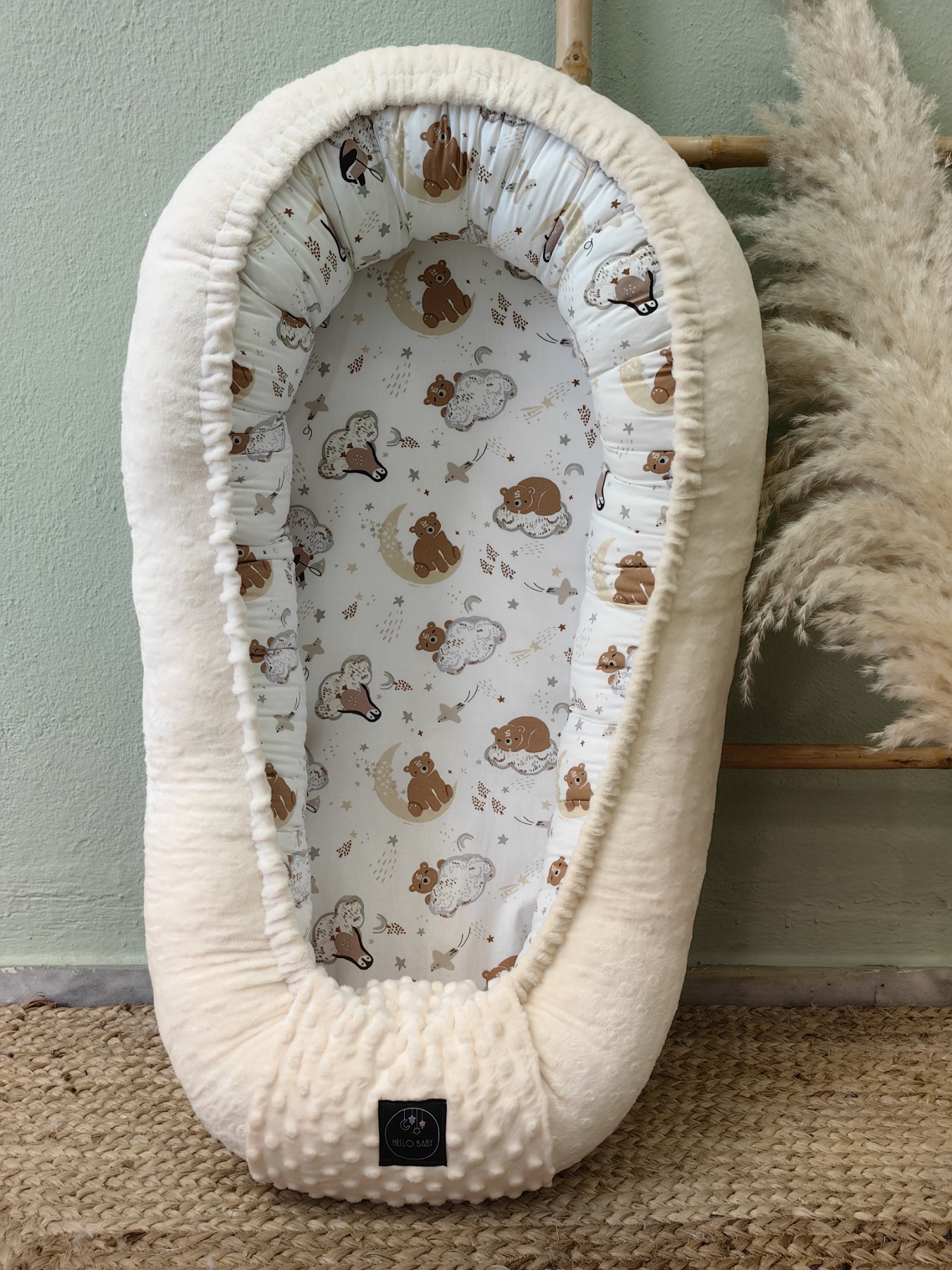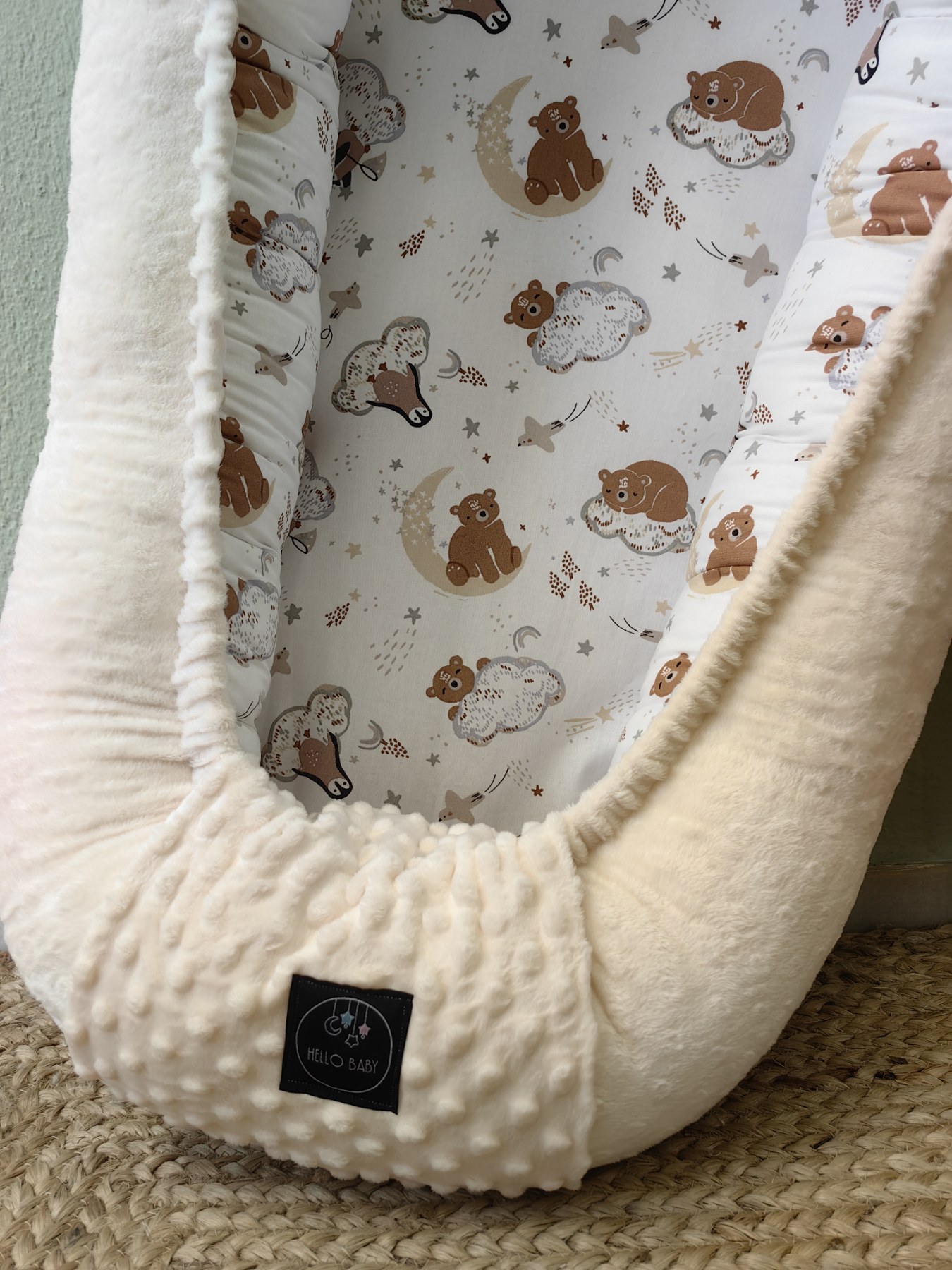Η φωλιά είναι διπλής όψης, με τη μία πλευρά από 100% βαμβακερό ύφασμα και την άλλη από απαλό βελούδινο minky, ιδανικό συνδυασμό για όλες τις εποχές.